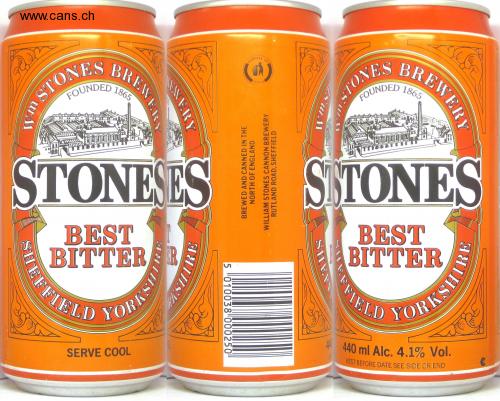 EFFIELD YORKSH STO. FOUNDED 186 TONES FOUNDED 186 DISPOSE OF IDILY 1000 STONESES SSTONES BEST BITTERR BEST BITTER TELI SERVE COOL 44 440 ml Alc. 4.1% Vol. BEST BEFORE DATE SEE SIDE OR END REWERY ANER KENERY SH IEF SHEF NORTH OF ENGLAND RUTLAND ROAD, SHEFFIELD BREWED AND CANNED IN THE WILLIAM STONES CANNON BREWERY 5 010038 000250 SHEFFIE