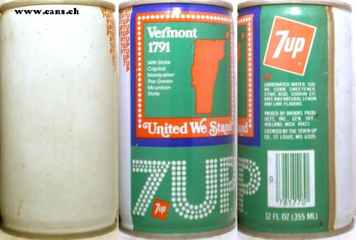 TUP 7UP PTU UP UP7U P P7U ZU 7UP P7U Verimont 1791 7up 7U 14th State Capital: Montpelier The Green CARBONATED WATER, SUG AR CORN SWEETENER. CITRIC ACID, SODIUM CIT RATE AND NATURAL LEMON AND LIME FLAVORS Mountain State United We Stapi nd PACKED BY BROOKS PROD UCTS, INC, GEN OFF HOLLAND, MICH 49423 LICENSED BY THE SEVEN UP CO., ST. LOUIS, M0. 63105. ZUP 781770 7up 12 FL OZ (355 ML)