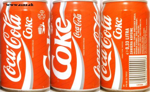 3CC23A CocaCola Coke TRADE MARKS REGD. COKE Coke Coca-Cola TRADE MARKS REGD Cola Coke oca ке ZNAKI TOW. ZASTRZ. %24 PN-86 A-79032 e 0,33 LITRA ZAWIERA KOFEINE SKŁAD: WODA, CUKIER, DWUTLENEK WĘGLA, BARWNIK KARMEL, KWAS FOSFOROWY, AROMAT NATURALNY, KOFEINA. PRODUCENT: COCA-COLA POLAND LTD., RADZYMIN/POLSKA WYPRODUKOWANO ZA ZGODĄ THE COCA-COLA COMPANY NAJLEP SZA PRZED: NA SPODZIE PUSZKI 966000 000677