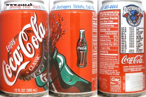 Destroy Your Thirst! fw r Destroyers Tickets, Call 1L4 BUFFA VERY LOW SODIUM, 35 mg OR LESS OR LESS PER 240 mL (8 f oz) VERY LON Nutr Nutrition Facts Serv.S Serv. Size 1 Can Amout Amount Per Serving April 15 April 22 April 29 May 6 May 12 May 19 May 26 June 2 June10 June 17 June 25 June 29 July 7-8 July 14 July 22 10:30 pm AT San Jose 8:30 pm AT Okdahoma Cy 7:30 pm 10WA 7:30 pm AT New England 7:30 pm NEW JERSEY 8:00 pm AT Albany 8:00 pm SAN JOSE 8:00 pm NEW ENGLAND 8:30 pm AT Nashvile 7:30 pm ALBANY 8:30 pm AT Houston 4:00 pm AT New Jersey 8:00 pm FLORIDA OPEN 8:00 pm LOS ANGELES Calori Calorles 140 %Dally Valse 0% Total F Total Fat 0g Sodiun Sodium 50mg 2% Total C Total Carb 39g 13% Sugar Sugars 39g Proteb Protein Og Coca-Cola "Percan based on Percent Dally Values are based on a 2,000 calorle dlet. Coca-Coa CARBONATE CORN STRP CARAMEL COL NATURAL FU CANNED INGE COCA-COLA ABARTA, CARBONATED WATER, HIGH FRUCTOSE CORN SYRUP AND/OR SUCROSE, CARAMEL COLOR, PHOSPHORIC ACID, MTURAL FLAVORS, CAFFEINE. CARNED UNDER AUTHORITY OF THE COCA-COLA COMPANY, ATLANTA, GA BY ANTA, INC., PITTSBURGH, PA 15238. 01999 THE COCA-COLA COMPANY CONSUMER INFORMATION CALL 1-800-438-2653 EASE Coke CLASSIC ORIGINAL FORMULA REC CYC 12 FL OZ (355 mL) CLASSIC Cola 2000-373 1999-2472
