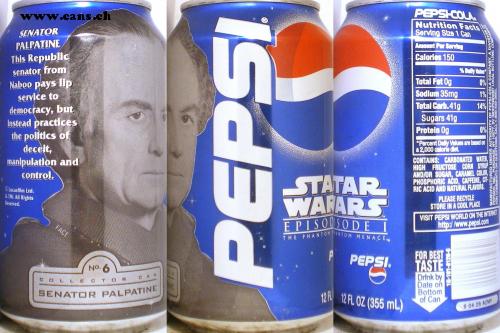 SENATOR PALPATINE THE PHANTONANTOM MENACE PEPSHCOLA Nutrition Facts Serving Stze 1 Can SENATOR PALPATINE This Republic senator from Naboo pays lip service to Amount Por Serving Calories 150 Total Fat Og Sodium 35mg Total Carb.41g % Dally Walo 0% 1% 14% democracy, but Instead practices the politics of decelt, manlpulation and control. Sugars 41g Protein Og 0% *Percent Dally Values are based on a 2,000 calorie diet CONTAINS: CARBONATED WATER, HIGH FRUCTOSE CORN SYRUP AND/OR SUGAR, CARAMEL COLOR, PHOSPHORIC ACID, CAFFEINE, CT RIC ACID AND NATURAL FLAVORS. PLEASE RECYCLE STORE IN A COOL PLACE VISIT PEPSI WORLD ON THE INTERNET http://www.pepsl.com STATAR CLucasfilm Ltd. & TM. All Rights Reserved. WARARS EPISOUSODEI FACE PEPSI. TASTE FOR BEST NO 6 Drink by Date on Bottom of Can CAN EOLL ECTOR NE 12 FL 12 FL OZ (355 mL) 9 04 28 A2MF MPANY