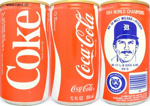 1984 WORLD CHAMPIONS WILCOX W-17 L-8 ERA 4.00 SV O 059 DETROIT Coca-Cola TIGERS 12 FL OZ 354 ml BY COCA-COLA BOTTLERS OF DETROIT. INC.. DETROIT. MICHIGAN 48210 CANNED UNDER AUTHORITY OF THE COCA-COLA COMPANY ATLANTA, GA. Trade-mark ® ALLALUMINUM Trade-mark (R) ALL ALUMINUM CAN Trade-mark PITCHER 069067