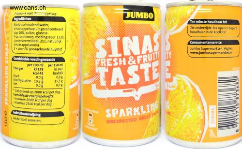 Frisdrank met : ppelsap Ingrediënten Koolzuurhoudend water, sinaasappelsap uit geconcentreerd sap 10%, suiker, glucose- fructosestroop, voedingszuur: E330, conserveermiddel: 211, natuurlijk sinaasappelaroma E = door EU goedgekeurde hulpstof. JUMBO Ten minste houdbaar tot Zie onderzijde. Na openen beperkt houdbaar in de koelkast. SINAS TASTE Consumentenservice Jumbo Supermarkten, Veghel. www.jumbosupermarkten.nl %3D Gemiddelde voedingswaarde RESH &FRUI per 100 ml per 150 ml kJ 178 kcal 42 Energie kJ 267 kcal 63 382980 Eiwit 0,0 g 15,3 g 0,0 g 0,0 g Koolhydraten 10,2 g 0,0 g "Gebaseerd op 2000 kcal per dag. Gemiddelde energiebehoefte: - vrouwen 2000 kcal per dag • mannen 2500 kcal per dag Vet Perblikje (150ml) Gebruiksaanwijzing Perb Lekker koel serveren. Dagelijkse badingarichtlijn 00 15cl e NIS DH I V 00BH 06 A