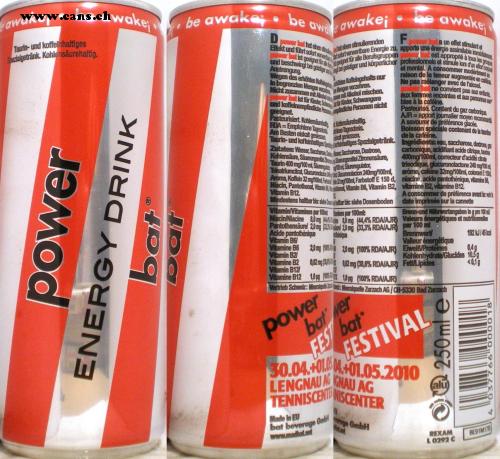 ig bel geistiger und körperlicher professionnels et stimule lors dun elifor corp rbat ist für Kinder Sch tr Kinder, Schwangere bat ist geeignet fra eignet für alle Berufsgruppen Nicht zusammen mit Alkahd miAlkohol mischen. Mtsatort verwertbare Energie zu apporte une énergle assimilable immédatenet Wegen des erhöhten Kollehnaan Koffeingehals nur und koffeinempfindiche Periniche Parsonen nicht Taurin-und koffeinhliges Spa arainhaltiges Spezialgetränk. Ingrédients: eau, saccharose, detrose Zutaten: Wasser, Saccharoe Da r Saccharose, Dexdtrose, RDA=Empfohlene Tagescostene Tagesdosis. awakej be awakej be awake be aw awakej be awake Taurin- und koffelnhaltiges Sezialgetränk. Kohlensäurehaltig. a un effet stimulant et wer bet hat einen st Effekt und führt sofort verwerte d einen stimulerenden est approprié à tous les grou und beschwingt bei geistiga u Anstrengung et mental. A consommer modérémert raison de la teneur augmentée en cal Ne pas mélanger avec de l'alcool in begrenzten Mengan verzd Hengen verzehren. ne convient pas aux enlant BLDK femmes enceintes et aux personmes bles à la caféine. Pasteurisé. Contient du gaz carbonlque AJR = apport joumaler moyen recommand A savourer de préférence glacée. Boisson spéciale contenant de la taurts de la cafélne. geeignet. Pasteurisiert Kohlensarehe iensäurehalg Am Besten eiskalt geniessen. skat geniessen. carbonique, acidifiant acide citrique, taur 400mg100ml, corecteur d'acidite cirale trisodique, glucuronolactone 240 mg10 Kohlensäure, SäuenurgsnitGaunsmitel Zironensäure, Taurin 400 mg100ml, Sama Sareregulalo, Tinatiumcirat GucurndkonEipndacion 240rmg100ml, aròme, cafeine 32mg/100ml, colorantE15 Aroma, Koffein 32 mg10m Fatem0m, Farbstoff E 150 d, niacine, acide pentothénique, vitamine B Niacin, Pantothenat Vitamin Be Vitamin B6, Vitamin B2, vitamine B2, vitamine B12 Vitamin B12 Mindestens haltbar bis slehe Dror bis: siehe Dosenboden Aconsommer de préfèrence avant le vath date imprimée sur la cannette Brenn-und Nährwertangaben In g pro 10ml/ Vitamin Vitamines par 10n ies par 100ml Niacin/Niacine &0mng (4A 80 mg (44,4% RDA/AJR) Valeurs énergétiques et nutrilomnelo Pantothensäurel 20mg 20 mg 33,3% RDA/AJR par 100 ml Acide pantothenique Vitamin BG Vitamine B6 Vitamin B2 Vitamine B2 Vilamin B12 Vilamine B12 10g 10pg (100% RDAIAJR) Vertrieb Schweiz: Mineralqul 2 192 kJ/45 Brennwert Valleur énergetique 949 20ng ( 20mg (100% RDA/AJR) EweißProtéines Q2m AA 02 mg (38,67% RDAIAJR) Fett/Lipides Kohlenhydrate/Glucides 10,5g <0,19 neralquelle Zurzach AG/CH-5330 Bad Zurzach power bater FESTIVAL 30.04.+0L M01.05.2010 FEST bat IAG LENGNAUN GNAU AG TENNISCEND INISCENTER alu Made In EU bat beverage Gmb www.madhat.not OmbH REXAM L0292 C 8E91M178 power ENERGY DRINK bat 250ml e 18L00 00,99 7 7. 7