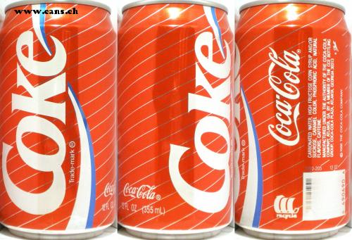 1990-205 12 OZ b bea Cola xh ZAL OZ (355 mL) recycle Coke Trade-mark O Coke mark O Trade mark CARBONATED WATER, HIGH FRUCTOSE CORN SYRUP AND/OR SUCROSE, CARAMEL COLOR, PHOSPHORIC ACID, NATURAL FLAVORS, CAFFEINE MANUFACTURED UNDER THE AUTHORITY OF THE COCA-COLA COMPANY, ATLANTA, GA BY A MEMBER OF THE CCE BOTTUING GROUP, COCA-COLA PLAZA ATLANTA, GEORGIA 30313 1986 THE COCA-COLA COMPANY 069067