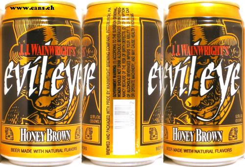 BEER MADE WITH NATURAL FLAVORS BEER MADE WITH NATURAL FLAVORS WAINWRIGHTS WAINWRIGHTS Evilewe evileye 12 FLOZ (355ML) 12 FLOZ (355ML HONEY BROWN D HONEY BROWN WORS BEERN DCER MADE WITH NATURAL FLAVORS BREWED AND PACKAGED WITH PRIDE BY WAINWRIGHT BREWING COMPANY, PITTSBURGH, PA DP221