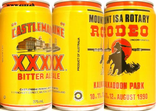 11 FINCHLEY STREET, MILTON, QUEE QUEENSLAND ASTLEMAANE MOUN UNT ISA ROTARY ROODEO (INCORPORATED) XXXX BITTER ALALE KALKIKADOON PARK CASTLEMAINE PERKINS LIMITE SUIMITED BLE RICICLADIL 10.1.1.12 AUGUST 1990 ALUN CAN 375 mL 4.8 % ALC/VOL PRODUCT OF AUSTRALIA