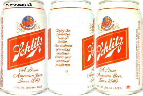 12 FL. OZ. (355 ml) • BEER 12 FL. OZ. (355 ml) • BEER SGHAT TRA SCHIT PURE MAY PURT MA SCHHLIT Enfoy the refreshtng taste of Schlitz. Our traðition Sehlit of brewing Excellence assures your continued satisfaction. AGreat American Beer Since 1849 Gl AGreat Ame American Beer Se Since 1849 12 FL. OZ TO THE BEVERAGE DURING PREGNANCY BECAUSE OF THE RISK OF BIRTH DEFECTS. (2) CONSUMPTION OF ALCOALCOC BEV- ERAGES IMPAIRS YOUR ABILITY TO DRIVE A CAR OR OPERATE MACHINERY, AND MAY CAUSE HEALTH PROBLEMS O JOS SCHLITZ BREWING COMPANY, DETROIT, MI, P.O. BOX 32875 BEST FLAVOR IF CONSUMED BEFORE DATE ON CAN BOTTOM STORE IN A COOL PLACE