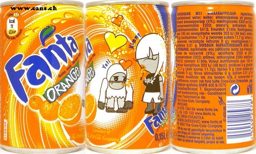 The Cocoa Cola Company ORANGE JUICE. Ingredients SOFT DRINK WITH sparkling water, sugar, orange juice from concentrate truffled orange juice (6%); food acids: E330 and E33). Preservative: E202; aromas; antioxidant E30 stabilizer: E412; dye: E160a. feeding wound per 100 ml: energy value 203 kJ (48 kcal); proteins 0g: carbohydrates 11.7g (of which sugars 11.7g); fats 0g (of which saturated fatty acids 0 ); dietary fiber 0 sodium 0.01 g. BOISSON RAFRAICHISSANTE AVEC JUS D'ORANGE. Ingredients: eau petillante; sugar; orange juice d base de concentrate (6%); acidifiers: E330 and E33); Conservator: E202; aromes; antioxidant: E300; stable E412; colorant: E160a. Valeur nutritionnelle pour 100 m voleurenergétique 203 kJ (48 kcal); proteins 0 g glusides 11.7g (dont sugar 11.7g); lipids 0 g (dont acldes qs satures 0 g); fibers alimentaires 0 g; sodium 0.01 g.let Best before: see bottom of tin. A consumer de préférence avant: voir fond lucky. Coco-Cola Enterprises Belgium spr/bvba BP/PB 400 B-1070 Bruxelles/Brussels 7. Produced with permission from-Conditionné ovec l'authorization de: The Coca Cola Company. INFOLINE: B:078-156156 www.fanta.be, L26 102 102 www.fanta.lu, NL: 0800-COCACOLA (0800-26222652) www.fanta.nl 2007 The Coca Cola Company. 06 Un the sun at moderate temperature In 0on dry on clean environment boworen.A preserver à l'obri du soleil done un endrolt tempéró, propre ef se0. 150ml kcal 72 daly anta ORANGE pipeduct of 0.15LC Amount 07BM 14B Gedap, brand- Marque dep marque dap. Yeti ORANGE RINGE