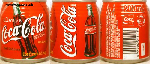 always 200ml boca-Cola PLEA Coke CocaCola Coca-Cola BECYCLE SOFT DRINK Mque unique delicious Refreshing Coca-Cola ACID, FLAVOURANTS AND CAFFEINE. CANNED BY COCA-CHO CANNERS OF SOUTHERN AFRICA (PTY) LTD., 96 MULLET ST WADEVILLE 1407, UNDER AUTHORITY OF THE COCA-COLA COMPANY, OWNER OF THE TRADEMARKS COCA-COLA, COKE, THE DYNAMIC RIBBON DEVICE AND THE RED DISK ICON. CONSUMER INFORMATION CALL 0800112526 ©1997 THE COCA-COLA COMPANY