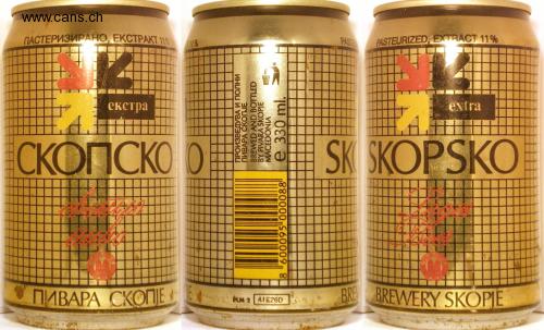PASTERIZED, EXTRACT 113 11% PASTEURIZED, EXTRACT 11% PASTE extra extra CKONCKO O E SK SKOPSKO SKOPE BREWERY BR BREWERY SKIPJE PLM 2 41E26D PRODUCES AND FULL BREWED AND BOTTLED 18 600095 000088 e 330 ml.