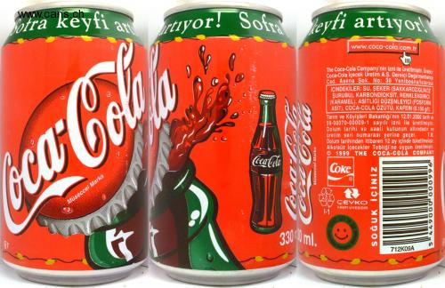 Coca-Cola Beverage Production Inc. Dereici Değirmenbahce Manufactured with permission of The Coca-Cola Company. Producer: ofra pleasure a it's going on! sof att it's going on! Soft Tape is on the rise! www.coca-cola.com.tr Chad. Asena Sok. No: 30 Yenibosna/istanbul INGREDIENTS: WATER, SUGAR (SACCAROSIGLUCOSE ŠURUBU), CARBONDIOXIDE, COLOURANT (CARAMEL), ACIDITY REGULATOR (PHOSPHORIC ACID), COCA-COLA EXTRACT, Caffeine (0.150 g/). Ministry of Agriculture and Rural Affairs dated 12.01.2000 and Manufactured with permission 59-00070-00009-1. The filling date and time are on the bottom of the box and replaces the production serial number. ca-Cola T.M. It should be consumed within 12 months from the date of filling. It is produced in accordance with the Communiqué on Non-Alcoholic Drinks. © 1999 THE COCA.COLA COMPANY Coca Cola Coke Trademark ÇEVKO FOUNDATION MEMBER 330ml. C7 712K09A Trademark DRINK COLD 66000 00