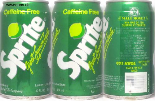 12 FL 0Z 354 354 mL ACIO NATURA NATURAL LEMON&LIME FLAVORS Lemon Lime S n-Lime Soda 8OTLING COMPAN ANT OF NORTH TEXAS DALLAS COCA COLA COMPANY ATA ATLANTA GA BY COCA COLA Caffeine Free Caffeine Free 2 MALL MONEY WIN ONE OF TEN SUBARU XT COUPES! Bring gold tabs and caps marked with the gold S$ and redeem them for Mall Mone at these malls COLLIN CREEK NORTH EAST TOWN EAST RIDGMAR RED BIRD GOLDEN TRIANGLE SIX FLAGS IRVING RICHLAND (WACO) SHERDEN (SHERMAN) PRESTONWOOD TOWN CENTER BROADWAY SQUARE (TYLER and listen to tnese stations for details ΚΕΥΡ.99 FM TYLER KWTX-FM 97.5 97.1 KECL WACO CARBONA ACID NATURAL ARBONATED WATER SUGAR CITRIC MATURAL LEMON&LIME FLAVORS BENZOATE IPRESERVATIVEI SALT SODIUM CITRATE SODIUM BER CANNED UN HED UNDER AUTHORITY OF THE on-Lime Soda upeduct of (oa Cola Cempany COCA COLA COMPANY ATLA 8OTTLING COMPANT Lemon Lime So ANY OF NORTH TEXAS DALLAS 12 FL 0Z 34 354 ml TEXAS 75221 Sprite Jaste Sprite Jast ALL AL UMINUM CAN