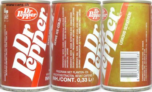 Dr Pepper Dr per FRISDRANK MET PLANTEN- EN VRUCH HUCHTENEXTRACTEN, BEVAT CAFEINE. INH INH./CONT.0,33 Le BAVARIA B.V. 5737 ZG LIESHOUT-HOLLAND ONDER LICENTIE VAN DR PEPPER COMPANY, DALLAS, TEXAS 75265, USA. lepper SERVE ICE SERVE ICE-COLD! INGREDIENTEN: WATER, SUIKER, VOEDINGSZUUR, KOOLZUUR, KLEURSTOF (KARAMEL). CONSERVEERMIDDEL, GEUR- EN SMAAKSTOFFEN (NATUURLIJK). CAFEINE. INGREDIENTS: WATER, SUGAR, NUTRITIOUS ACID, CARBON DIOXIDE. COLOUR (CARAMEL), PRESERVATIVE, NATURAL FLAVOURINGS, CAFFEINE. INGRÉDIENTS: EAU, SUCRE, ACIDIFIANT (E330), ACIDE CARBONIQUE, COLORANT, CONSERVATEUR (80 P.P.M.). AROMES NATURELS, CAFEINE. IJSKOUD SERVEREN! 8 714800 001083 TENMINSTE HOUDBAAR TOT EINDE: ZIE BODEM, BEST BEFORE END: SEE BASE OF CAN. A CONSOMMER DE PREFERENCE AVANT FIN: VOIR FOND DE LA BOITE.