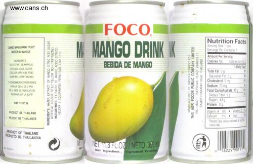 NET 11.8 FL.OZ/NETO 350 m Main Ingredient Ingredient Principal FOCO, M MANGO DRINK K Nutrition Facts Serving Size 1 can Servings Per Container 1 CANNED MANGO DRINK "FOCO" BOISSON AU MANGUE Amount Per Serving INGREDIENTS: Całories 180 Calories from Fat 0 BEBIDA DE MANGO EAU, EXTRAIT DE MANGUE, % Daily Value" 0% CITRTQUE ACIDE, SUCRE, Total Fat 0g Saturated Fat 0g Cholesterol 0 mg Sodium 70 mg Total Carbohydrate 45 g 15% Dietary Fiber 1g Sugars 43 g Protein 0g COULEUR ARTIFICIEL FD&C JAUNE NO. 4 (TARTRAZINE) 0% 0% A CONSOMMER DE PREFERENCE DANS UN DELAI DE 2 ANS 3% DE LA DATE DE FABRICATION FIGURANT SUR LA BOITE" 4% EMB 75113 N. PRODUCT OF THAILAND Vitamin A 0% • Vitamin C 6% Calcium 0% • Iron 8% PRODUIT DE THAILANDE "Percent Daily Values are based on a 2000 calorie diet. PRODUCT OF THAILAND PRODUCTO DE THAILANDIA NET Sw FC05R-3 Main Main Ingredient 16229 90117 2 Ingredient Principal INGREDIENTS: WATER, EXTRACT OF MANGO, CITRIC ACID, SUGAR. ARTIFICIAL COLOUR FD & C YELLOW NO.4 (TARTRAZINE). INGRADIENTES: EXTRACTO DE MANGO, ACIDO CITRICO AZUCAR Y COLORANTES PERMITIDOS E102, E110. MANUFACTURED BY: MANUFACTURADO POR: THAI AGRI FOODS PUBLIC COMPANY LIMITED 155/1 MOO 1 THEPARAK ROAD BANGPLEE SAMUTPRAKARN 10540 THAILAND