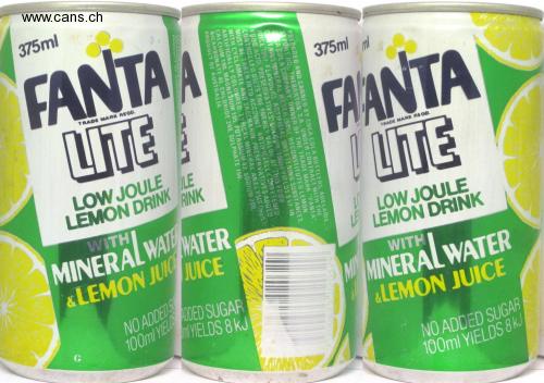 375ml FANTAA LITE 375ml TRADE MARK REGD. FAANTA ! LITE LOW JOULE TRADE MARK REGD. RINK WITH MINERALWATE &LEMON JUUICE ATER LOW JOULE LEMON DRINK ED S ADDED SUGAR WITH MMINERAL WATER LEMON JUICE m/ YIELD YIELDS 8 kJ NO ADDED SUGAR PREPARED AND CANNED BY COCA COLA BOTTLERS ADELAIDE 33 PORT RO. THEBARTON, S.A., UNDER CONTRACT WITH THE TA COLA COMPANY, OWNER OF THE TRADE MARK "FANTA". CNTAINS MINERAL WATER (94%), RECONSTITUTED LEMON JUICE 15%), FLAVOURS ARTIFICIAL SWEETENING SUBSTANCES, FOOD ACID, PRESERVATIVES GOLOUR. 100ml YIELDS 8 kJ. IN CONTROLLEC OIETS THE ENERGY VALOE OF THIS FOOD MUST BE TAKEN INTO ACCOUNT ARTIFICIALLY SWEETENED WITH CYCLAMATE AND SACCHARIN. PRESERVATIVES ADDEU ARTIFICIALLY COLOURED. TYPICAL MINERAL ANALYSIS (mg/L: CALCIUM 190, MAGNESIUM 105, POTASSIUM 43, SODIUM 200, BICARBONATE 45, CHLORIDE 240, SULPHATE 150. PRODUCT OF AUSTRALIA.