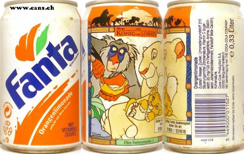 THE LION KING AE POINT WITH VITAMIN C ADDITIVE Gode ndes Fanta competition! Call them: 018 01805/331616 O Disney 4HK12A Film collection motif fanta Orange lemonade colored with beta-carotene TRADEMARK Orange lemonade Ingredients: water, sugar, lemonade base [mlt Acidifier citric acid, vitamin C (added sets: 20 mg / 100 ml ready-to-drink), aroma, stable sator locust bean gum, dye beta-carotene], Carbonic acid. Coca-Cola Production S.A. 59380 Bergues / France With permission from THE COCA-COLA COMPANY e 0.33 liters Best before the end: see can bottom