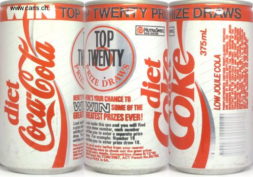 draw, Fo rew. For example: Number 18 entites y titles you to enter prize draw 18. entide y entiles you to enter a separate prize a prize d prize draw number, each number Look ini Look inside this can and you will find NSW Permit No.TC89/2057, ACT Permit No.89/758. Peck up an entry leaflet from your nearest puricipating store to check out the great prizes ind full entry details. Competition closes 8/12/89. WIN TOP TWERTY PRIIZE DRAWS NUTRASWEET MET. TOР I WENTY BRAND SWEETENER DRAW MERES ERE'S YOUR CHANCE TO WI WIN SOME OF THE GRENE GREATEST PRIZES EVER! Look ins Look inside this can and vou will find tw. For example: Number 18 Mudes you to enter prize draw 18. Peck Pick up an porteipetin and full enty ASW Pormi Entry ia FRE çle Entry is FREE in SA. let TRADE MARK REGD PRILL fPRIZE SME TRADE MARK REGD 375mL LOW JOULE COLA PHENYLKETONURICS: CONTAINS PHENYLALANINE. PREPARED AND CANNED BY COCA-COLA BOTTLERS, TASMANIA, 120 RAVENSWOOD ROAD, LAUNCESTON, TAS. 7280, AUSTRALIA, UNDER CONTRACT WITH THE COCA-COLA COMPANY, OWNER OF THE TRADE MARKS DET COCA-COLA' AND DIET COKE. CONTAINS CARBONATED WATER, COLOUR (180, ARTIFICIAL ASPARTAME, FOOD ACIDS TIVE (211), CAFFEINE EETENER .330), FLAI VAM383