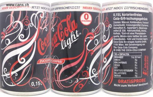 Not intended for sale. NEW TASTE - NOW EVEN MORE REFRESHING! NEW GIFT - NOW EVEN MORE REFRESHING! NEW TAG - NOW EVEN MORE REFRESHING! NEW DEAL NOW EVEN REFRESHING) ERF 0.15L calorie-free Cola soft drink Coke light. CALORIES Ingredients: water, carbonic acid, color Caramel, sweetener (cyclamate, Acesulfame K, aspartame *), acidification medium (E 338, sodium citrate), flavor, Caffeine. * Contains a phenylalanine source. Best before see Can bottom. Store in a cool and dry place. Coca-Cola Beverages Austria GmbH, 1100 Vienna. With permission from The Coca-Cola Company. © 2005 THE COCA-COLA COMPANY 100 ml CONTAIN: CALORIFIC VALUE PROTEIN CARBOHYDRATES SUGAR FAT SATURATED FATTY ACIDS 0g FIBER SODIUM 1 kJ, 0.2 kcal 0g 0g 0g 0 g SUGAR-FREE 0g 0g FREE SAMPLE 0.15L Info line Zace