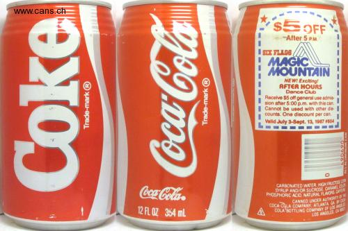 PHOSPHORIC ACID. NATURAL FLAVORS. CAFFEINE $5OFF -After 5 P.M. SIX FLAGS MAGIC MOUNTAIN NEW! Exciting! AFTER HOURS Dance Club Receive $5 off general use admis- sion after 5:00 p.m. with this can. Cannot be used with other dis- counts. One discount per can. Valid July 3-Sept. 13, 1987 #804 Coca-Cola 12 FL OZ 354 mL LOS ANGELES. CA 90021 Trade-mark Trade-mark ALLALUMINUM CAN
