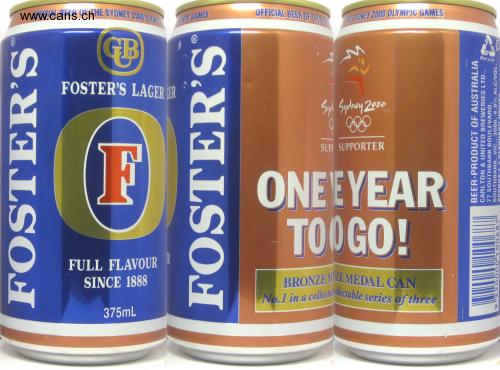 LESYONEY 2000 OLYMPIC GAMES No.1 in a collectuvollectable series of three BRONZEME MEDAL CAN OFFICIAL BEER OF THE SYDNEY 2000 0IR OFFICIAL BEER OF THESI IMPIC BAMES GB Recycle FOSTER'S LAGER ER Syd Sydney 2000 F SUPF SUPPORTER ONEEYEAR TOOGO! R FULL FLAVOUR SINCE 1888 ZE 375mL FOSTER'S FOSTER'S BEER-PRODUCT OF AUSTRALIA CARLTON & UNITED BREWERIES LTD., 77 SOUTHBANK B OULEVARD, SOUTHB ANK, VIC., 3006. 4.9% ALC/VOL. APPR OX 1 4 STANDABD DRIN KS 8900 L O0 0