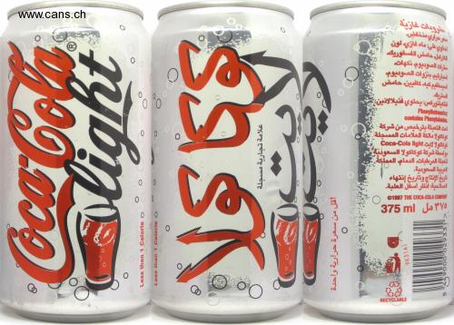 شروبات غازية سعر حراري منخفض۔ تحلوي على: ماء غازي لون لارال، حامض الفسفورية سطرات الصودیوم، نکهات اسبارتيم بنزوات الصونیوم اسبسلظیم کیه كافي ين، حامض الستريه اتکيتنورس: يحتوي فتيلالانين Phenylketowurice comtains Phenylalanine. تمت التعبئة بترخيص من شركة كوكاكولا مالكة العلامات المسجلة Coca-Cola light c بواسطة شركة كوكاكولا السعون العبئة المرطبات، الدمام الم ملكة. الربية السعودية. تاريخ الإنتاج وتاريخ إنتهاء الصلاحي: انظر اسفل العلبة. 10 ©1997 THE COCA-COLA COMPMY 00 ۳۷٥ مل ا375 RECYCLABLE Less than 1 Calorle o Less than 1 Calorle O علامة تجارية مسجلة رية واحدة أقل من سعرة 9K31A1