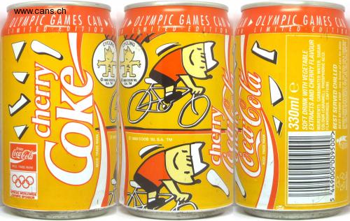 OLYMPIC GAMES CAN LIMITED EDITION L MITEU EDITIO IMITED EDITION OLYMPIC GAMES CAN OLYMPIC GAMES CA CYCUN CICLING © 1988 COOB % S.A. TM 1988 COOB 92, S.A. TM © 1980 © 1988 COOB '92, S.A. TM cherry/ Coke REGD. TRADE MARK cherry CecalC REGO. TRADE MARK 330ml e SOFT DRINK WITH VEGETABLE EXTRACTS AND CHERRY FLAVOUR INGREDIENTS: CARBONATED WATER, SUGAR. COLOUR (CARAMEL), PHOSPHORIC ACID. FLAVOURINGS, CAFFEINE. 006600 00067 BEST SERVED CHILLED 5. BEST BEFORE END see base of can for date CANNED UNDER AUTHORITY OF THE COCA- COLA COMPANY BY THE COCA- COLA EXPORT CORP. IN THE UK AT L ONDON W8 SSN RECYCLABLE ANDIN IRELAND AT PO BO X 1645 DUBLIN 2