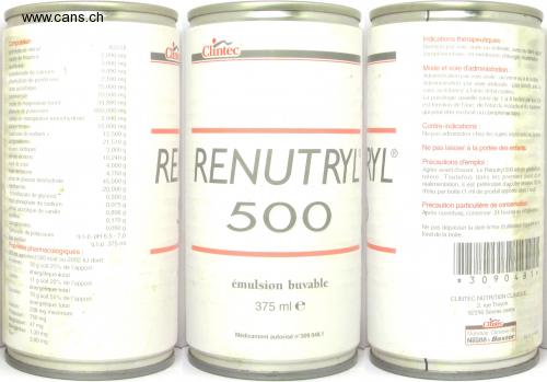 Do not exceed the expiry date shown on the Authorized drug n ° 309 048.1 375 ml provide 500 kcal or 2092 kJ including: Proteins: 32 g or 25% of the intake Carbohydrates: 70 g or 55% of the intake Therapeutic indications: Oral or enteral nutrition, with or without awA complementary, in medicine, surgery, resuscitation Composition: retinol palmitate thiamine nitrate nbofiavine calcium pantothenate pyridoxine hydrochloride ascorbic acid nicotinamide heavy magnesium oxide potassium chloride manganese sulfate monohydrate ferrous sulphate sodium caseinate. lactoproteins lactic yeasts skimmed dry milk soy hule hull of butter dehydrated glucose syrup sucrose Clintec Chi 833 IU 2,890 mg 3,000 mg 9.490 mg Method and route of administration: Oral administration: by glass or spoon Enteral administration: no catheter with or unassisted low continuous flow. The usual dosage varies from 1 to 6 boxes per day. Ele depends on the age, condition of the patient and the treatment which can be exclusive or complementary. 2,100 mg 75,000 mg 10,500 mg 34.880 mg 600,000 mg 3.940 mg 15,000 mg Contraindications: Do not administer to subjects intolerant to lactose 12.500 g 21.510 g 3,000 g 10.240 g 4,000 g 4.750 g 45,000 g 20,000 g 0.500 g 0.075 g 0.806 g 0.170 g 0.050 g Keep out of the reach of children. (R) RE RENUTRYLYL Precautions for use: Shake before opening. Rénutryl 500 is generally ben tolerated. However in the first days lasts make-up, it is better to add about 125 m of water per box (1 ml of product then provides 1 kcal Special precaution for storage: Arpres opening, keep 24 hours in the refrigerator. glycerol monostearate sodium ipolyphosphate alcoholic vanilla extract vanillin 500 Do not exceed the expiry date shown on the bottom of the box. carrageenan potassium hydroxide purified water q.s.p. pH 6.5 - 7.0 9.s.p. 375 ml Pharmacological properties: o ml provide 500 kcal or 2092 kJ including: * 309048 11 total energy 11 g or 20% of the intake total energy 70 g or 55% of the intake total energy 338 mg maximum Lpides drinkable emulsion CLINTEC CLINICAL NUTRITION 2, rue Troyon 92316 Sèvres cedex 375 ml e Sodium: Clintec Potassium: 750 mg Magnesium: 47 mg Manganese: 1.30 mg Iron: Clinical Nutrition Nestlē & Baxter Ret 011 / 34ME 3.00 mg
