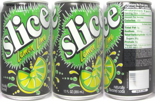 lice slice Contains No Fruit Juice Caffeine Free Low Sodium Nutrition Facts Serving Size 1 Can Ammeunt Per Serving Calories 150 % Daily Value Total Fat 0g 0% Sodium 55mg 2% Total Carbohydırate 40g 13% Sugars 39g Protein 0g "Percent Dally Values are based on a 2,000 calorie diet. CONTAINS: CARBONATED WATER, HIGH FRUCTOSE CORN SYRUP AND/OR SUGAR, CITRIC ACID NATURAL LEMON AND LIME FLAVORS, POTASSIUM BENZOATE (PRESERVES FRESHNESS), POTASSIUM CITRATE, SALT AND CALCIUM DISODIUM EDTA (IU PROTECT FLAVOR). PREPARED BY PEPSI-COLA GENERAL BOTTLERS INC., GENERAL OFFICES. ROLLING MEADOMS 60008 UNDER AUTHORITY OF PEPSI-COLA COMPAT Zemon ine Lemon aturaly avored națurally flavored soda 12 FL OZ (355 mL) 304 A 242 PLEASE RECYCLE 308-101