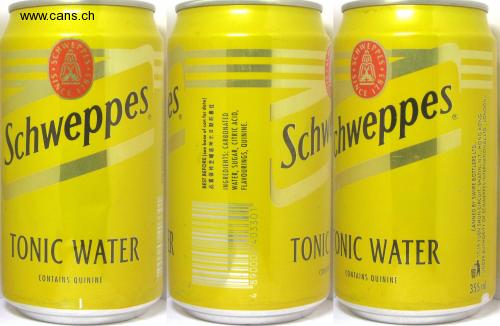 VCE Schwej pes Sch TONIC WATER TON NIC WATER CONTAINS QUININE CONT CONTAINS QUININE 355 ml BEST BEFORE (see base of can for date) INGREDIENTS: CARBONATED WATER, SUGAR, CITRIC ACID, FLAVOURINGS, QUININE. SINC CANNED BY SWIRE BOTTLERS LTD., 17-19 YUEN SHUN CIRCUIT, SHATIN, N.T., HONG KONG UNDER AUTHORITY OF SCHWEPPES INTERNATIONAL LTD., LONDON.