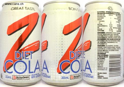NUTRITIONAL INFORMATION PER SERVING INFORMATION NUTRITIONNELLE PAR PORTION WITH ASPARASPARTAME BONG GREAT TASTE NUTRITIONAL IONFORMATION.PER SERVING INFORMATION NUTRITIONNELLE PAR PORTO SERVING SIZE SERVINGS PER CONTAINER ENERGY CALORIES KJ PROTEIN. CARBOHYDRATES 04g 355 ml PAR PORTION PORTIONS PAR CONTENANT ENERGE CALORIES 22 6 02g KJ PROTÉNES GLUCIDES Og MATIÈRES GRASSES SODIUM ASPARTAME FAT SODIUM. ASPARTAME.. 57 mg 177 mg DIET COLAA COLA INGREDIENTS: CARBONATED WATER, CARAMEL COLOUR, PHOSPHORIC ACID, ASPARTAME (CONTAINS PHENYLALANINE), SODIUM CITRATE SODIUM BENZOATE, NATURAL FLAVOUR, CAFFENE RECOMMENDED FOR CALORIE REDUCED DIETS * NUTRASWEET AND THE NUTRASWEET SYMBOL ARE REGISTERED TRADEMARKS OF THE NUTRASWEET CO INGRÉDIENTS: EAU GAZÉIFIÉE, COLORANT CARAMEL, ACIDE PHOSPHORIQUE, ASPARTAME (CONTIENT DE LA PHÉNYLALANINE), CITRATE DE SODIUM, BENZOATE DE SODIUM, ESSENCE NATURELLE, CAFEINE RECOMMANDE POUR LES RÉGIMES Á TENEUR RÉDUTE EN CALORIES. * NUTRASUC ET LE SYMBOLE NUTRASUC SONT DES MARQUES DÉPOSÉES DE THE NUTRASWEET CO DIEFE ZELLERS STORES INC. MONTRÉAL QUÉBEC, CANADA OLA HYPOCALORIQUE MEC ASPARTAME CALORIE COLA LOW CALORIE COLA 355MLNURAS, 355mL 355mL MOUE DEA COr ESML ONUTRASWEET WITH ASPA MAND SWEETENER