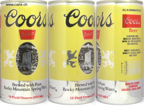 12 Fluid Ounces (355 ML) Brewed with P th Pure Rocky Mountain Sp pring Water ALL ALUMINUM RECYCLE Coors Cooris Cocis Вeer Promium Premu CONTAINS ONLY NATURAL INGREDIENTS WITH NO PRESERVATIVES OR ADDITIVES. MADE FROM MALTED BARLEY, CEREAL GRAINS AND HOPS Brewed with Pure Water ADOLPH COORS COMPANY Rocky Mountain Spring Wate Rocky Mountain Sp Spring Water GOLDEN, COLO. 80401 (355 ML) 12 Fluid Ounces (355 ML) 719974