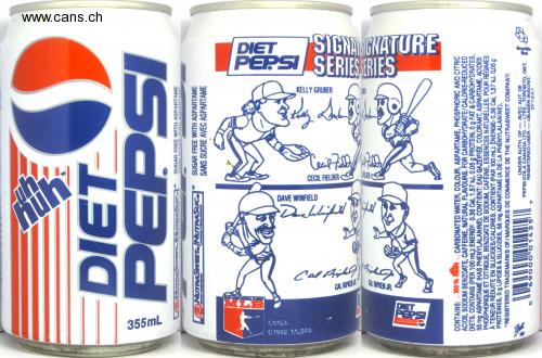 SIGNANGNATURE DIET PEPSI SERIESERIES KELLY GRUBER CECIL FIELDER DAVE WINFIELD OAL RIPKEN JR CAL RIPKEN A DIET PEPSI CMSA ©1992. MLBPA DIET- PEPSI ISc SUGAR FREE WITH ASPARTAME SANS SUCRE AVEC ASPA RTAME SUGAR FREE WITH ASPARTAME SANS SUCRE AVEC ASPARTAME CONTAINS: .. 100 % FAl. CARBONATED WATER, COLOUR, ASPARTAME, PHOSPHORIC AND CITRIC ACIDS, SODIUM BENZOATE, CAFFEINE, NATURAL FLAVOURS. FOR CARBOHYDRATE/CALORIE-REDUCED DIETS. CONTAINS (PER 100 mL): ENERGY: 0.38 Cal, 1.57 kJ, 0.05 g PROTEIN, O g FAT &CARBOHYDRATES, 55 mg ASPARTAME (HAS PHENYLALANINE). CONTIENT: EAU GAZEIFIÉE, COLORANT, ASPARTAME, ACIDES PHOSPHORIQUE ET CITRIQUE, BENZOATE DE SODIUM, CAFÉINE, ESSENCES NATURÉLLES, POUR RÉGIMES À TENEUR RÉDUITE EN GLUCÍDES/CALORIES. CONTIÉNT (PAR 100 mL): ENERGIE: 0,38 Cal, 1,57 kJ, 0,05 g PROTÉINES, O g IPIDES&GLUCIDES, 55 mg ASPARTAME (A DE LA PHÉNYLALANÍNE). *REGISTERED TRADEMARKS OF/MARQUES DE COMMERCE DE THE NUTRASWEET COMPANY. UNDER AUTH. OF AVĘC AUT. DE PEPSHCOLA CANADA LTD.-LTEE., TORONTO, ONT. REGISTERED USER-USAGER INSCRIT. 2F12A1