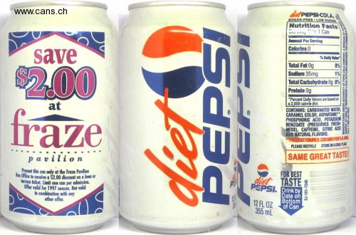 die PEPSICOUA SUGAR-FREE LOW SODIUM Nutrition Facts Suiving Cire 1 Can Amount Per Serving Calories 0 save % Dally Value* Total Fat Og 0% $200 fraze Sodium 35mg 1% Total Carbohydrate 0g 0% Protein Og *Percent Daily Values are based on a 2,000 calorie diet. CONTAINS: CARBONATED WATER, CARAMEL COLOR, ASPARTAME", PHOSPHORIC ACÍD, POTASSIUM BENZOATE (PRESERVES FRESH- NESS), CAFFEINE, CITRIC ACID AND NATURAL FLAVORS. "HEKETONURICS: CONTAINS PHENYLALAE PLEASE RECYCLE STORE INA COOL PLACE pavilio n раv SAME GREAT TASTE! Present this can only at the Fraze Pavilion Box Office to receive a $2.00 discount on a lawn or lerroce ficket. Limit one can per admission. Offer valid for 1997 season. Not valid in combination with any other offer. FOR BEST TASTE S PEPSI. Drink by Date on Bottom of Can diet PE 12 FL OZ 355 mL 4.26 0R02 MANUFACTURED UNDER OF A OF PQUESTIONar SOMERS, NY 10589, BY INDEPENDENT LOCAL BOTTLING COMPANIES. FOoR COMMENTS CALL 1-800-433-2652.
