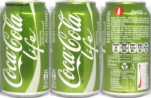 Coca-Cola Crie FANTASY DRINK. INGREDIENTS: CARBONATED WATER. SUGAR, CARAMEL COLOR, NATURAL FLAVORS, ACIO PHOSPHORIC, STEVIA (STEVIOL GLYCOSIDES), BENZOATE OF SODIUM AND CAFFEINE. MANUFACTURED BY ENVASES CENTRAL S.A. CALLE MIRAFLORES N S75 - RENCA, R.M. BEEF. SESMA N ° 9938 OF 04-20-95. MANUFACTURING CHILEAN. KEEP IN A COOL, DRY AND PROTECTED PLACE SUN. DO NOT FREEZE. CONSUME BEFORE THE DATE INDICATED ON THE BASE OF THE CAN. COCA-COLA LIFE IS A REGISTERED TRADEMARK OF THE COCA-COLA COMPANY. O 2013 THE COCA-COLA COMPANY CONSUMER INFORMATION: 800 21 99 99. Each 350 ml can contains: Calories stoneware greases Sodium phrases saturated totals 63 15.8 g 0.0 g 0.0 g 35 mg 3% 18% 0% 0% 1% % of Daily Reference Value for an adult based on 2000kal SWEETENED WITH Sweetener Dose mg in final drink 100 ml Serving mg / kg wt coprn 15.2 GOING Stevia + Sugar Stevia (steviol equiv.) 7.6 To the Luth 350 ml 350ml can Heat 63 Galordas 63 Nutritional information Serving: 1 glass (200ml) Servings Per Container: Approx. 2 3% 3% 100 ml 1 Serving 18 Energy (kcal) Proteins (g) Total Fat (g) H. de C. Disp. (g) Total sugars (g) 4.5 Sodium (mg) 36 % Based on 2000 keal 2000 kal 150 ml 4.5 350 m 9.0 s20 $ 10 SWEETENED Naturally LOW CALORIES LOW CALORIES SWEETENED Naturally LOW HEATS सतन SWEETENED Naturally LOW CALORIES 80 161 0 720035 7894 P V1 REXAM