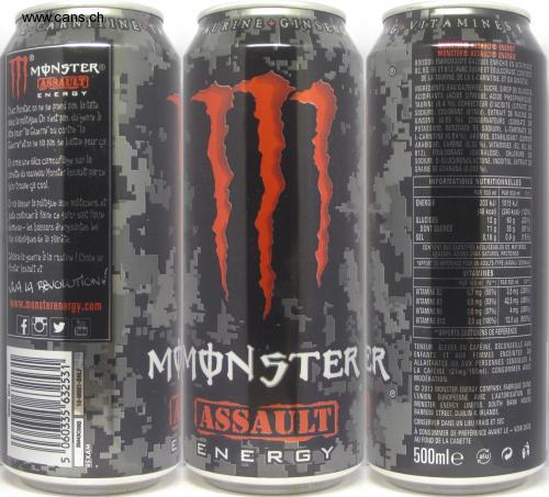 © 2013 MONSTER ENERGY COMPANY. MADE IN THE EUROPEAN UNION WITH THE AUTHORIZATION OF CAFEINE (21mg / 100ml). CONSUME WITH B2, B3, B6 AND B12. WITH SUGAR AND SWEETENER. GAS ENERGY DRINK ENRICHED WITH VITAMINS TAURINE, L-CARNITINE, AND GINSENG INGREDIENTS: CARBONATED WATER, SUGAR, GLUCOSE SYRUP AURINEGINSEN L-CARNITINE TA E, NERGY TO CONSUME PREFERABLY BEFORE - SEE DATE MONSTER ENERGY LIMITED, SOUTH BANK HOUSE VITAMINS & MONSTERG ASSAULT® ENERGY MONSTER ® ASSAULT ENERGIE MONSTER ASSAULT ACIDIFIERS (CITRIC ACID, PHOSPHORIC ACID TAURINE (0.4%). ACIDITY CORRECTOR (CITRATE SODIUM). COLOR (E150d), ROOT EXTRACT GINSENG (0.08%). PRESERVATIVES (SORBATE OF POTASSIUM, SODIUM BENZOATE), L-TARTRATE L-CARNITINE (0.04%), FLAVORS, STABILIZER (GUM ARABIC), CAFEINE (0.02%), VITAMINS (82, B3, 86. B12), SWEETENER (SUCRALOSE), CHLORIDE SODIUM, D-GLUCURONOLACTONE, INOSITOL, EXTRACT OF GUARANA SEED (0.002%). ENERGY Cez Manster, we don't take the lead Bicla plitque. We are not duigehre to ate for "the War or against" the Guerte "and we're not going to fight for that. Oha put a camouflage decoration on the baked from the new Monster Assault because gion thinks that is cool. NUTRITIONAL INFORMATION PER 100 ml PER 500 ml We went to policy politicians, and ista continue to do what we know how to do e better- energy drinks s evil planet. ENERGY 203 kJ / 1015 kJ / (48 kcal) (240 kcal) (12) 60 g (23%) 55 g (61% 0.18 g 0.9 g (15%) CONTAINS NEGLIGIBLE AMOUNTS OF MATERIALS FATS, SATURATED FATTY ACIDS, PROTEINS * REFERENCE INTAKE FOR A TYPICAL ADULT (8400KJ / 2000kcal CARBOHYDRATES WITH SUGAR SALT 12g 11g WO Adlare the war on the routine! Mug um Moster Assault and VITAMINS MY 14 REVOLUTION www.monsterenergy.com VITAMIN. B2 VITAMIN B3 VITAMIN B6 VITAMIN B12, PER 100 ml (% * ") PER 500 ml (") 0.7 mg (50%) 3.5 mg (250%) 8.5 mg (53%) 42.5 mg (2654) 4 mg (285% 4) 0.8 mg (57%) 2.5 pg (100%) 12.5 pg (500%) * DAILY REFERENCE CONTRIBUTIONS You Tube MMONSTERR HIGH CAFFEINE CONTENT, NOT RECOMMENDED FOR CHILDREN AND PREGNANT WOMEN U BREASTFEEDING OR PERSONS SENSITIVE TO MODERATION. © 2013 MONSTER ENERGY COMPANY. MADE IN ® ASSAULT MUNSTER ENERGY LIMITED, SOUTH BANK HOUSE BARROW STREET, DUBLIN 4, IRELAND. STORE IN A COOL AND DRY PLACE AT THE BOTTOM OF THE CAN El 500mle (alu 5 "Ö60335 632531 2M43C06B 10-MO01-BNLF REXAM