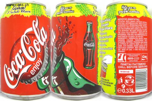 Patenao PHOSPHORIC ACID, AROMATIC SUBSTANCES COFFEE PRODUCED AND PACKAGED IN CYPRUS COLOR: CARAMEL COLOR MEASUREMENT INGREDIENTS: WATER, SUGAR, ANORAKA DIOXIDE grato Kiadiae! 8Suzuki Vitara GAS REFRIGERATOR, inepoi FROM THE COMPANY LANITI BROS LTD TO. 2200. 1515 NICOSIA, WITH LICENSE FROM THE COCA-COLA COMPANY. ANAANEH KATA PREFERENCE: BEFORE THE DATE THAT WRITTEN ON THE BASE OF THE BOX. INGREDIENTS: CARBONATED WATER, SUGAR. CARAMEL COLOR, PHOSPHORIC ACID. FLAVOURS, CAFFEINE. PRODUCED AND CANNED IN CYPRUS BY LANITIS BROS. LTD. P.O.BOX 22000, 1515 NICOSIA, UNDER LICENCE OF THE COCA-COLA COMPANY. BEST CONSUMED BY: SEE BASE OF CAN. © 1999 THE COCA-COLA COMPANY. Δοίδομάδα Coca-Cola edia. KOn ha-Cola. line of communication CONSUMERS Coke 0800-2222 no charge CocaCola DRINK ICE CHILL BEFORE SERVING WIBH14B MEPE MEZA ETIE EX XAI ETA ENTYTIA NOY TA CHMEIA NOAHEHE NAY AND e0.33L 966000 00067 oluay Coca-Cola