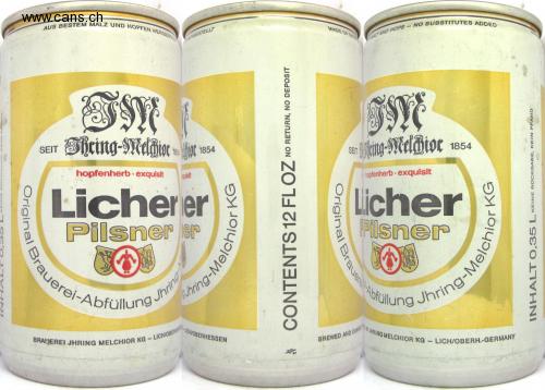 Brauerei-Abfüllung Jhring AUS BESTEM MALZ UND HOPFEN HERGESTE BREWED AND CAN SHRING MELCHIOR KG. BRAJEREI JHRING MELCHIOR KG- LICH/OBERICHIOBERHESSEN NO SUBSTITUTES ADDED MADE OF ES ERGESTELLT ALT AND HOPS. SEIT Sicing-Meldie nse 18 Mor 1854 Nting-SMelBtor SEIT 1854 hopfenherb. exquisit quisht hopfenherb exquisit Lịcherer Pilsner er Licher Plsner uerei-Abfüllu Jhring-Me Abfullung BRAJEREI JHRING MELCHIOR KG- BREWED AND CANN LICH/OBERH.-GERMANY $ CONTENTS 12 FL OZ NO RETURN, NO DEPOSIT uere- INHALLT0,35L KEINE ROCKGABE, KEIN PFAND