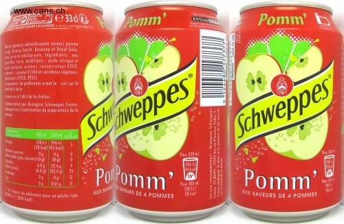 CONSIGNE POUVANT VARIER LOCALEMENT > www.consignesdetri.l AUX SAVEURS DE 4 POMMES " de l'opport de référence pour un adulte-type dont acides gras saturés) (0 g) NX SAVEURS DE 4 POMMES PENSEZ AU TRI! CANETTE METAL A RECYCLER LO e 33d Pomm' Service Consonma ON Cristal Pomm' t Appel non surlaxe. Seie uniquement en France Ma ACIER RECICLAB RECYCLEERBAARST eaine Aoisson gazeuse ratraichissante saveurs pomme rouge, Granny Smith, Boskoop et Royal Gala, TOuge, orec sucre et édulcorants. Ingrédients : eau gozeifiée, sucre, acidifiants : acide citrique et pcide malique, arômes, conservateur E202, rolorants : caramel E150d et carotènes végėtaux, edulcorants (E950, E955). À consommer de préférence avant le : voir sur le fond de la boite. 1783 1783 A conserver à l'abri de la chaleur. Commercialisé par Orangina Schweppes France. fobriqué avec l'autorisation du propriétaire de la Schweppes morque. Schweppes Decloration mutritionnelle: 100 ml 330 ml (330 ml) Energie 120 kJ 396 kJ 5 (28 kcal) (93 kcal) Motieres grasses 0 g Pour 330 ml: 0 g (0 g) 6,8 g 22,4 g Pour 330 ml: Glucides Idont sucres) 396 kJ 93kcal 5% 396 kJ 93kcol 9 PoPomm' (6,8 g) (22,4 g) Pomm' Protéines 25 5X Sel 0 g 0 g Pour 100 ml: 120 k3/ 28 kcal Pour 100 ml 120 kJ 28 kcal 0,01 g 0 9 SAVEURS DE 4 POMMES t Pport de référence pour un adulte-type 18400 AS/2000 kcal). AUX SAVEUR AUX SAVEURS DE 4 POMMES Service consommateurs : Orangina Schweppes France, CS 80491, 13593 Aix-en-Provence Cedex 3 france (indiquer la date el le numéro du lo1 inscrits sur le fond de la boite). 1244 80 SOL 801 EL H 2720/2