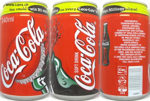 Mega Millions show! You couid win R5 mil illion on every Coca-Cola You couid win R5 mil ion on every Coca-Colo 340ml INGREDIENTS: CARBONATED WATER, SUGAR, CARAMEL, PHOSPHORIC ACID, FLAVOURANT AND CAFFEINE. CANNED BY COCA-COLA CANNERS OF SOUTHERN AFRICA (PTY) LTD., 96 MULLET STREET, WADEVILLE 1407, SOUTH AFRICA, UNDER AUTHORITY OF THE COCA-COLA COMPANY, OWNER OF THE TRADEMARKS COCA-COLA, COKE, AND THE DESIGN OF THE CONTOUR BOTTLE. © 2002 THE COCA-COLA COMPANY. CONSUMER INFORMATION CALL 0860112526 CocaCola Coke Coca Cola RECYCLE SABS 449 NO8M2D aCola SOFT DRINK oca 008701: Si ,לל