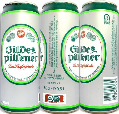 DOSEN RECYCLING PREE (DUG DIG DLG 1546 www Gillde pililener Gildes pillener err Das Hopfenfrische BIER BEER CERVEZA BIRRA OLLING BRAUE CE alc. 4,9% vol. 50 50 cl e0,5 I Marken quartat aus deutschen Landen n UTAL GONTOLLIERT PLM 2 92G10D ORIGINAL BRAUEREIABFO ORIGINAL HANNOVER Da consumarsi preferibilmente entro: Vedi data sul fondo. Consumir preferentemente antes de: ver debajo. Mindestens haltbar bis Ende: siehe Boden. Best before: See base of can. O.G. 1044-1050 Birra prodotta e confezionata da: Fabricada y envasada por: Gilde Brauerei Hannover, Gebraut und abgefüllt bei: Brewed and canned by: W.-Germany/Germania Occ/Alemania Occ. 4 "101 030"01331
