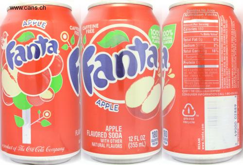 Contains No Juice Nutrition Facts Serv. Size 1 Can APPLE CAFFE CAFFEINE FREE Amount Per Serving Fanta ana Calories 180 100% 00% NATURA ATURAL FLAVOR LAVORS % Daily Value* Total Fat Og Sodium 50mg Total Carb 48g 16% Sugars 48g Protein 0g 0% 2% Not a significant.source of fat cal., sat. fat, trans fat, cholest.. fiber, vitamin A vitamin C. calcium and iron. *Percent Daily Values are based on a 2.000 calorie diet. ©2011 THE COCA-COLA COMPANY CONSUMER INFORMATION CALL 1-800-438-2653 00 APPLE TM please recycle APPLE FLAN FLAVORED SODA 180 180 12 FL OZ CALORIES PER CAN EALURIES FE CAN WITH OTHER Auduct of The Coca-Cola Cempany NATURAL FLAVORS (355 mL) REXAM www.fanta.com CARBONATED WATER, HIGH FRUCTOSE CORN SYRUP, NATURAL FLAVORS, CITRIC ACID, MALIC ACID, CARAMEL COLOR, SODIUM BENZOATE AND POTASSIUM SORBATE (TO PROTECT TASTE). SODIUM CITRATE. CANNED UNDER AUTHORITY OF THE COCA-COLA COMPA ATLANTA, GA 30313 BY A MEMBER OF THE COCA-COLA BOTTLERS ASSOCIATION, ATLANTA, GA 30327. 2011-0644