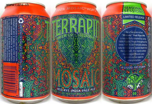 E BEER CO, 265 NEWTON BRIDGE ROAD ATHENS CA SHORED RYE INDIA PALE:ALE BEER CO.ATHENS 100% MOSAICHOPS SEASONAL SESSIONS TM LIMITED RELEASE TERRAPI Like a fine piece of art, "Mosaic" Red Rye IPA is masterfully created by using 100% Mosaic"" hops throughout the brew. With its äesthetically pleasing ruby red color and spatial depth from the rye malt, this hand crafted masterpiece feaves your palate's canvas open to interpretation. BEER CO “A·LIQUID:ART FORM!" 1OSAI Ball GA 30607 TERRAPIN BEET :80 GOVERNMENT WARNING: (1) ACCORDING TO THE SURGEON GENERAL, WOMEN SHOULD NOT DRINK ALCOHOLIC BEVERAGES DURING PREGNANCY BECAUSE OF THE RISK OF BIRTH DEFECTS. (2) CONSUMPTION OF ALCOHOLIC BEVERAGES IMPAIRS YOUR ABILITY TO DRIVE A CAR OR OPERATE MACHINERY, AND MAY CAUSE HEALTH PROBLEMS. 99539 00057 411 21 A1 B P 12 FL. OZ. ALC:/.VOL. 6.2% PACK IN PACK OT