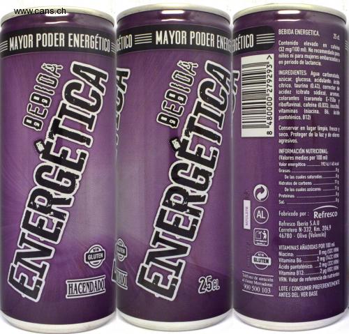 Vitamina B12. 2 ug (807 VRN Vitamina B6:. 2 mg (143% VRN Telefono de atención VRN: Valor de referencia de nutrientes A niños ni para mujeres embarazadas o Contenido elevado en cafeina MAYOR PODER ENERGÉTIC ICO= MAYOR PODER ENERETICO = BEBIDA ENERGETICA. 25 dl (32 mg/100 ml). No recomendado para niños ni para mujeres embarazadas o en periodo de lactancia. INGREDIENTES: Agua carbonatada azúcar, glucosa, acidulante: ácido cítrico, taurina (0,4%), corrector de acidez (citrato sódico). aromas, colorantes (caramelo E-150a riboflavina). cafeína (0,03%), inositol vitaminas (niacina, B6, ácido pantoténico, B12) Conservar en lugar limpio, fresco y seco. Proteger de la luz y de olores agresivos. INFORMACIÓN NUTRICIONAL: (Valores medios por 100 ml) Valor energético: . 192 KJ145 kcal Grasas:. 0g De las cuales saturadas:. L11g 11g Hidratos de carbono: De los cuales azúcares: Proteínas: Sal L0g AL Fabricado por : Refresco Refresco Iberia S.A.U Carretera N-332, Km. 206,9 46780 - Oliva (Valencia) CONTENGDOR AMAPLLO VITAMINAS AÑADIDAS POR 100 ml Niacina: . ELUTEN SIN GLUTEN 8 mg (50% VRN SIN GLUTEN Acido pantoténico: ..2 mg (33. VRN Vitamina B12:.. 25a al cliente Mercadona: HACENDADO 900 500 103 ANTES DEL: VER BASE BEBIDA M7CL27B 3001517 1| 8 480000 279293