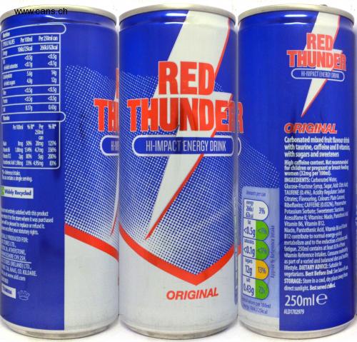 TROLWALIES Per 10ml Per 250ml can 1064/25kcal 266k/62kcal <05g RED THUNDE Action RED TH THUNDE 1.5g Tit <0.1g HI-IMPACT ENERGY DRINK tstrtes <0.1g 5.6g 4.89 14g 12g 15g <05g <05g <05g 0.3g re 0.17g ORIGINAL onis Per100ml %R Per % R* 250ml Carbonated mixed fruit flavourdink with taurine, caffeine and B vitamir, with sugars and sweeteners High caffeine content. Not recommendel for children or pregnant or breast-feing women (32mg per 100ml). INGREDIENTS: Carbonated Water, Glucose-Fructose Syrup, Sugar, Adit: Cnickit; TAURINE (0.4%), Addity Regulator Sdum Citrates; Flavouring, Colours: Plain Cael Riboflavins; CAFFEINE (0.032%), Presenatie Potassium Sorbate; Sweeteners: Sucalse Acesulfame K; Vitamins: Niadn, Pantodheic. Vitamin B6, Vitamin B12. Niadin, Pantothenic Add, Vitamin B6a i B12 contribute to normal energy-y can HI-IMPACT ENERGY DRINK &ng 50% 20mg 125% tri6 1.8mg 134% 47mg 336% trh 82 2g 80% Spg 200% oteik Ad 198ng 33% 495mng 83% 1-ldrene Itake ka ontais asingle seving Amounts per can Widely Recycled energy 266 3% 62ical Rndertrey satished with this product amitb hestore where it was purchased ellepese to eplace or refund it. usntfictyou satutory rights. EOALY PRODUCED FOR: USTORES LTD., SK 16,ATHERSTONE, NICISHIRE CV9 2SH. USTORES (RELAND) LTD., 76, NAAS, CO. KILDARE. 1satwww.aldi.com fat <1% saturates 0.1g <1% fatigue. 250ml contains at least 83%d vitamin Reference Intakes. Consume mot Sugars lifestyle. DIETARY ADVICE: Suitable fr 12g 13% STORAGE: Store in a cool, dry place awoy direct sunlight. Best served chiled salt 043g 7% 250mle TIAMOSA ORIGINAL ral values per 100ml bergy 106k1/25kcal ALD1702979 Approx % Reference Intake