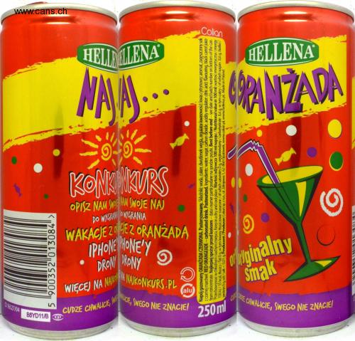 WIĘCEJ NA NAK NAJKONKURS.PL E CHWALICIE, SWEGO NIE ZNACIE! Colian HELINMLENA HELLENA ADA KOMKURS OPISZ NAM SM SWOJE NAJ WAKACJE 2 E2 ORANŻADĄ inalny Smak alu UCIE, SWEGO NIE ZNACIE! 016327/04 B5YD11/B CP CUDZE CHWALICIE, 250ml 5 900352 013084"> Napój gazowany ORANŽADA CZERWONA. Pasteryzowany. Skladniki: woda, cukier, dwutlenek wegla, regulator kwasowośi: kwas cytrynowy, aromat, zageszczony sok z zamej marchwi. RED ORANGEADE- carbonated drink. Pasteurized. Ingredients: water, sugar, carbon dioxide, acidity regulator. ditric acid; flavouring, black carot juice from concentrate. Najlepiej spożyć przed końcem- datai numer parti podane na spodzie puszki. Best before end - see date and batch number on bottom of the can. Przechowywać w chłodnymi suchym miejscu. Keep in a dry and cool place. Wartość odżywcza 100 ml napoju:/Nutritional value in 100 ml: wartość energetyczna/energy 150 kJ/35 kcal, thuszcz/fat 0g, w tym kwasy thuszczowe nasycone/of which saturates O g weglowodany/carbohydrate 8,6 g wtym aukry/of which sugars 8,6g białko/ protein Og sól/salt<0,01 g Producent/Producer:Colian sp. za.o, ul. Zdrojowa 1,62-860 Opatówek, www.colian.pl, www.hellena.pl, Made in Poland.