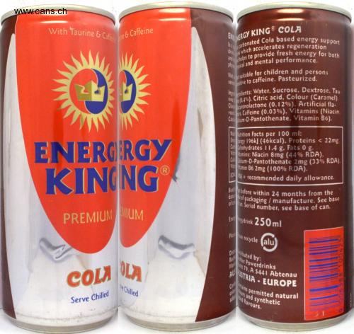 andhelps to provide fresh energy for both Isa rarbonated Cola based energy support urs and synthetic date of packaging / manufacture. See base kt 79, A 5441 Abtenau With Taurine & Callene ASTRIA- (0.4%). Citric acid, Colour (Caramel). otains permitted natural seno sitive to caffeine. Pasteurized. of can. Serial number, see base of can. phy sical and mental performance. Ingre redients: Water, Sucrose, Dextrose, Tau Bestst before within 24 months from the Not suitable for children and persons With Taurine & Cat6 Caffeine nich accelerates regeneration drim and phyical and mental performance. Gluc curonolactone (0.12%). Artificial fla- VOunrs, Caffeine (0.03%), Vitamins (Niacin Calcium-D-Pantothenate, Vitamin B6). rine ENERGRGY KINNG Nututrition Facts per 100 ml: Energy 196kJ (46kcal). Proteins < 22mg Ca erbohydrates I I.4 g. Fats 0 g. Vittamins: Niacin 8mg (44% RDA). Ca Glkium-D-Pantothenate 2mg (33% RDA). Vittamin B6 2mg (I00% RDA). RDA RODA recommended daily allowance. Enydrink 250ml PREMIUMIUM ple se recycle alu Ditributed by: Baler Powerdrinks it 79. A 5441 Abtenau AUSTRIA - EUROPE OLA COLA urs and synthetic ded flavours. e Chilled Serve Chilled 言 388