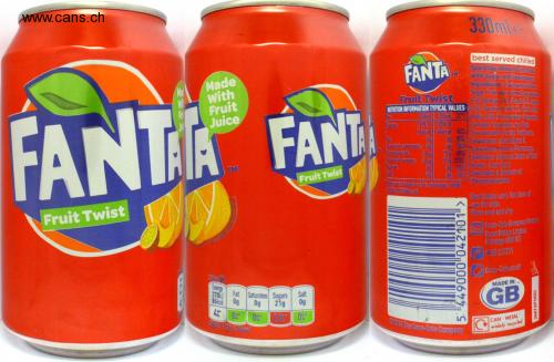 330mlc best served chilled Sparkling Mixed EruitOr with Sugar and Suectenero Ingredients: Cationaind Kiam Sugar ru Julces fum Eance FANTA Made with Fruit Juice Fruit Twist NUTRITION INFORMATION TYPICAL VALUES Fascicn Crut 1.5 C FANTIA FAN 100ml 330ml () Maiecid Fcaerivo Crtusin 712KJ/|370k/ 23koal 86kcal (4Concortatca (Ca TO Sailier) Sortiate Vagclano ad Plant Fak rwnion saturates: fq Carbohydrate, ciwhch sugars: 6g obin. Salte י naia ןוח GARODRJ72000ka) (82) 21g 232) Rosins Cuar Cum Containo o Scurco of Phemyialaniae. Fruit Twist Fruit Twist Cect Eofare end Sec tase of Can for tate. Shre coal and dry Coce-Ecla European Petim freat Briain Linfied Ctigs UBO 1EZ 9002771 Coce-Cala.com Energy 370KJ 86kcal 0g MADE IN Fat Saturates Sugars Salt 0g GB 0g 21g 237 0 2015 The Coca-Cola Company CAN METAL widely recycled