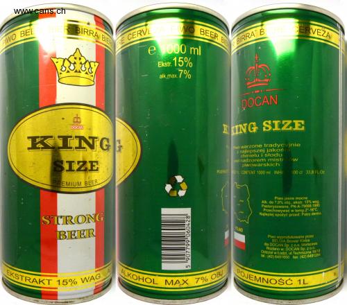 BIRRA B RE CERVEZA BIER BIRRA BIER tel.: (42) 6491650 fax: (42) 6491284 POJEMNOŚĆ 1L Oddział w Łodzi, ul. Techniczna 16/18 dla DOCAN Sp. z o.0. Warszawa ERE FIWO BEER BIE EKSTRAKT 15% A PREMIUM BEER ALKOHOL MAX 7% OBJ RIER BIRRA BIR PIWO BEE e 1000 ml Ekstr. 15% alk.max. 7% DOCAN KKING SIZE DOCAN KING; Piwo warzone tradycyjnie z najlepszej jakości chmielu i słodu pod nadzorem mistr ÓW piwowarskich Pi SIZE POJEMNON SC IL CONTENT 1000 ml INHA 100 cl 33,8 FL.Oz Piwo jasne mocne Alk. do 7,0% obj., ekstr. 15% wag. Pasteryzowane, PN-A-79098:1995 Przechowywać w temp.2°-16°C. Najlepiej spożyć przed: Patrz denko. Ners STRONG BEER POLAND Piwo wyprodukowane przez BELGIA Browar Kielce dla DOCAN Sp. z 0.0. Warszawa Rozlano w: DOCAN Sp. Z .0. ALKOHOL KSTRAKT 15% WA