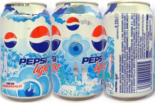 PEPSSI PEPS GO UP Www.PEPSI.IT BRO OPEN S ANGNG AUD OR PIGTAL MUSIC PEPSI. light CONTENT 0.33LE SOFT DRINK WITH SWEETENERS INGREDIENTS: WATER, CARBON DIOXIDE, DYE: E 150d, ACIDIFIERS: ACID ORTHOPHOSPHORIC AND CITRIC ACID, SWEETENERS: ASPARTAME AND ACESULFAME K, ACIDITY CORRECTOR: TRISODIUM CITRATE, PRESERVATIVE: E 211, AROMAS (INCLUDING A CAFFEINE). CONTAINS A SOURCE OF FENILALAÑINA. PACKAGED WITH AUTHORIZATION OF PEPSICO INC., PURCHASE, N.Y., BY A.M.S. BENEDETTO S.p.A. HEADQUARTERS AND FACTORY VIALE KENNEDY, 65- SCORZE '(VE) ITALY LOT OF PRODUCTION AND TO BE CONSUMED PREFERABLY BY THE END: SEE INDICATIONS ON THE BOTTOM. KEEP IN A DRY AND CLEAN PLACE AT SHELTER FROM HEAT SOURCES. NUTRITIONAL INFORMATION (on 180 ml) ENERGY VALUE: 0.3 kcal-1.1kJ FAT PROTEIN: CARBOHYDRATES OF WHICH SUGARS OF WHICH SATURATED FATTY ACIDS FOOD FIBERS SODIUM 60'0 0.0 g
